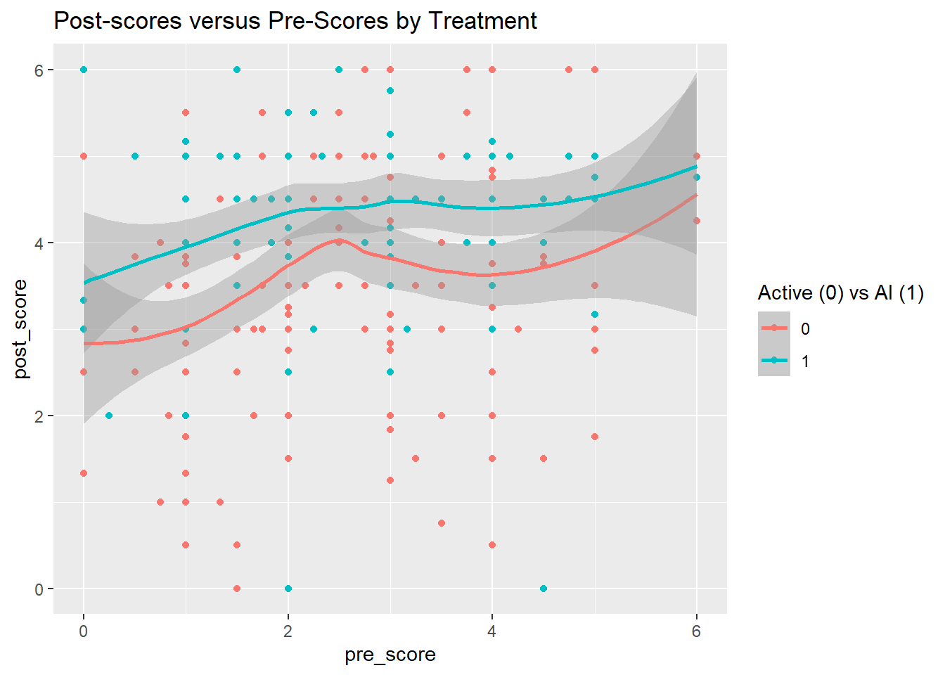 If we plot the raw data and fit nonparametric smooth trend lines, we see the same general result. Controlling for pre-score, there are slighter higher post-scores for the AI group.
