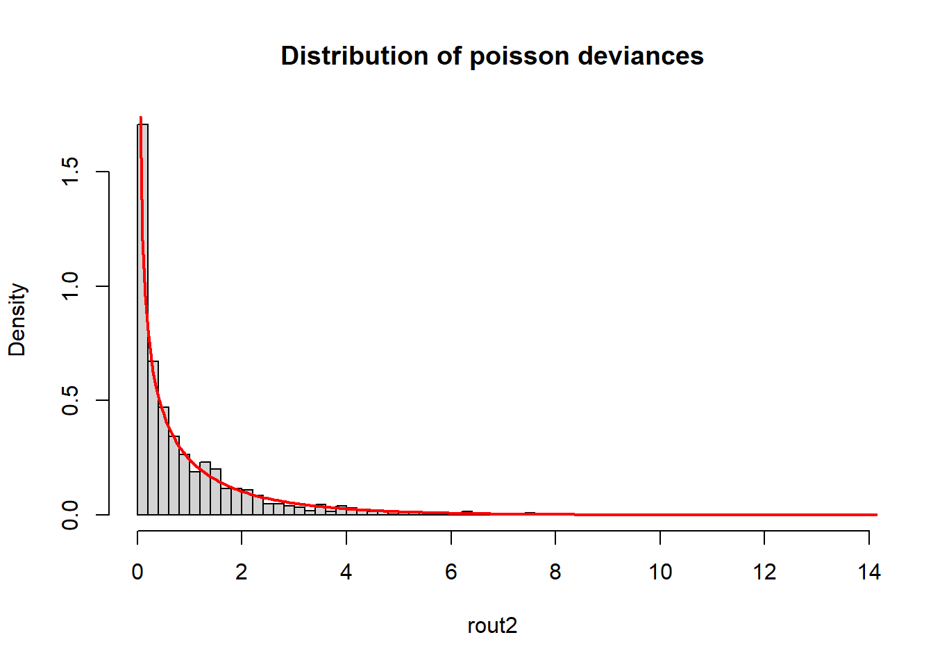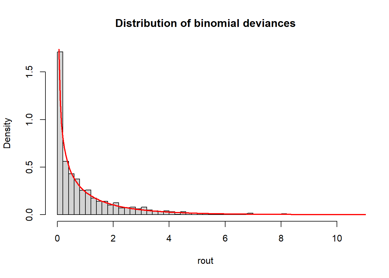 Now plot a histogram of the deviances and overlay a chi-square distribution with one degree of freedom. (I used trial-and-error to determine the value of n, which is the number of values used to evaluate the chi-square function.) The deviances are indeed well-modeled with a chi-square distribution.