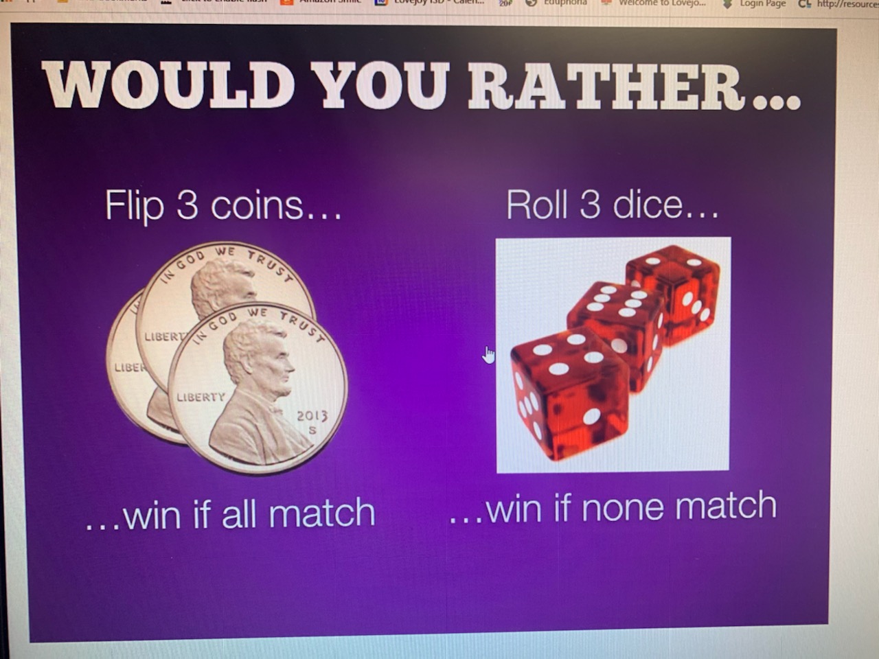 Clearly we’d rather roll the dice (assuming fair coins and fair dice).
